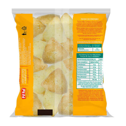 Farinha de trigo enriquecida com ferro e ácido fólico, carne bovina, água, tomate, margarina, ovo, açúcar, cebola, leite integral, pimentão, fermento biológico, óleo composto, tempero (alho e sal), caldo de galinha, suco de limão, molho de pimenta, pimenta síria. CONTÉM GLÚTEN. ALÉRGICOS: CONTÉM TRIGO, OVOS, LEITE E DERIVADOS DE SOJA.