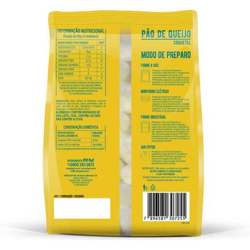 Água, fécula de mandioca, polvilho azedo, amido modificado, óleo de soja, gordura vegetal, queijo Minas, ovo em pó, soro de leite em pó, condimento de queijo parmesão, sal. CONTÉM DERIVADOS LÁCTEOS E NÃO CONTÉN GLÚTEN.