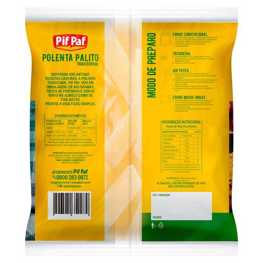 Desfrute do sabor autêntico da Polenta Palito Tradicional Pif Paf. Feita com ingredientes selecionados e seguindo uma receita tradicional, esta polenta é perfeita para acompanhar diversos pratos ou como petisco. Sua textura macia por dentro e crocante por fora proporciona uma experiência gastronômica única. Prática e versátil, basta fritar ou assar para apreciar seu delicioso sabor. Adicione um toque especial às suas refeições com esta polenta tradicional.